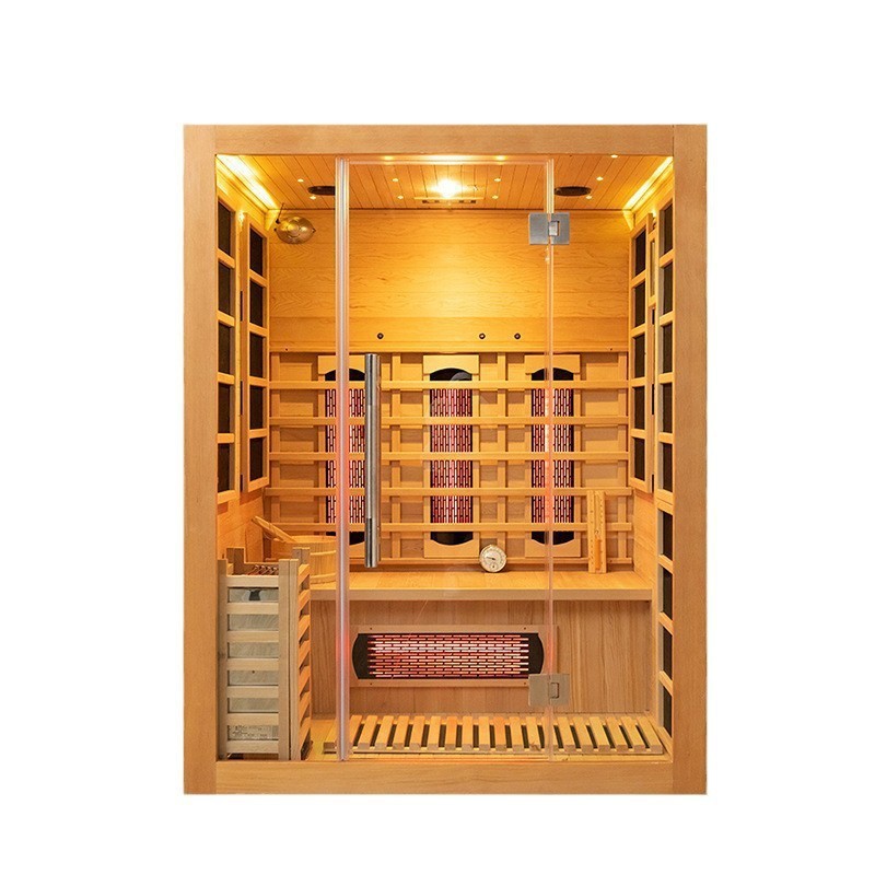 1-3 nəfərlik taxta İnfraqırmızı və Buxar Sauna Otağı sağlamlıq səyahətinizi artırmaq üçün qabaqcıl xüsusiyyətlərlə doludur: İnfraqırmızı Qızdırıcılar və Uzaq - İnfraqırmızı Qrafen Qızdırıcı Plitələr (dərin, rahatlaşdırıcı tər üçün bərabər, səmərəli isitmə təmin edir); Oxygen Ionizer (sauna daxilində havanı təmizləyir, təravətli və canlandırıcı atmosfer yaradır); Reading Light & Speaker (sizə sauna seansından həzz alarkən musiqi oxumağa və ya dinləməyə imkan verir); İdarəetmə Paneli (fərdi təcrübə üçün temperaturun, vaxtın və digər parametrlərin asan tənzimlənməsinə imkan verir); Sauna Sobası və İşıq Dalğası Borusu (buxar və infraqırmızı istilik yaratmaq üçün birlikdə işləyirik, həm buxar, həm də uzaqdan - infraqırmızı sauna həvəskarlarına xidmət edir).