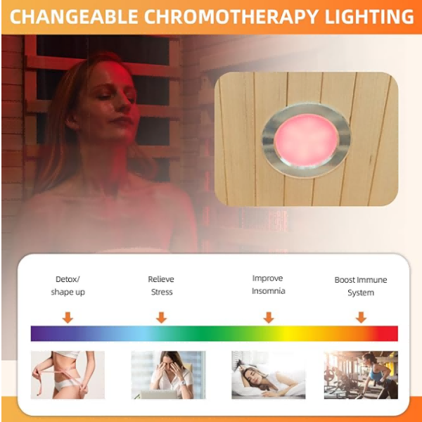 【İnkişaf etmiş istirahət】 Ev üçün infraqırmızı saunalarımız, ümumi təcrübənizi artırmaq üçün immersive atmosferi yaradan 7 rəngli işıq terapiyası ilə bir dam örtüklü bir dam xüsusiyyətləri. Zirzəminizdə, vanna otağı və ya idman zalı, və Bluetooth bağlantısı və bir oksigen çubuğunuzda asanlıqla quraşdırıla bilər, rahat bir sauna seansından ləzzət ala bilərsiniz