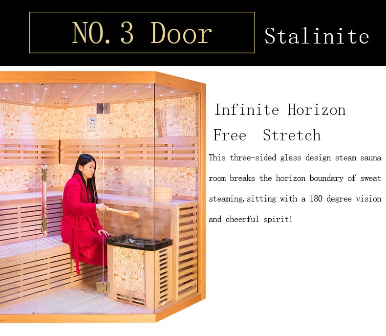 Yenilikçi olaraq üç tərəfli Stalinit xüsusi şüşə qapı quruluşunu özündə cəmləşdirən bu şüşə xüsusi yüksək temperaturda istiləşmə müalicəsindən keçir, üstün istilik müqaviməti və təsir müqaviməti təmin edir. Sauna daxilində 70℃-dən yuxarı temperaturda belə sabitliyi qoruyur, ultra yüksək şəffaflıq və optik təhrif yoxdur. Üç tərəfli şüşə dizaynı ənənəvi saunaların dar və qapalı hissini tamamilə qıraraq 180 dərəcə maneəsiz geniş görünüş əldə edir. İstifadəçilər saunadan həzz alarkən xarici mühitlə vizual əlaqə saxlaya bilər, bu da onu ev eyvanları, həyətlər və digər ssenarilər üçün ideal hala gətirərək daha rahat və rahat ağıl və bədən üçün istilik terapiyası keçirərkən açıq mənzərəni qiymətləndirməyə imkan verir. Bundan əlavə, daxili inteqrasiya olunmuş ulduz işığı atmosfer sistemi yuxarı və yan divarlardakı gizli LED işıq zolaqları vasitəsilə parıldayan ulduz effekti yaradır. Yumşaq işıq ilıq buxarı tamamlayır, göz yorğunluğunu effektiv şəkildə aradan qaldırır və immersiv və xoş sauna atmosferi yaradır.