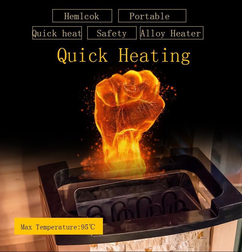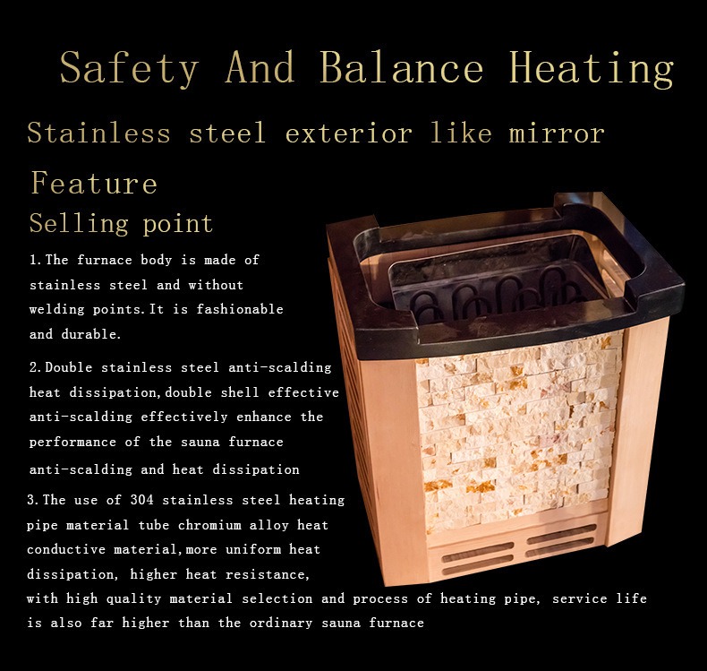 Bundan əlavə, sauna qızdırıcısı temperatur təhlükəsizlik həddini keçdikdə avtomatik olaraq söndürülən, istilik səmərəliliyinə və istifadəçinin təhlükəsizliyinə ikiqat zəmanət verən həddindən artıq istidən qorunma cihazı ilə təchiz edilmişdir.